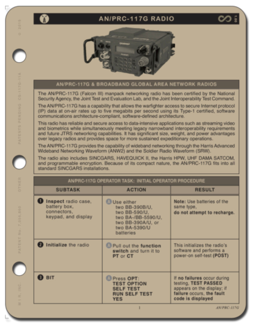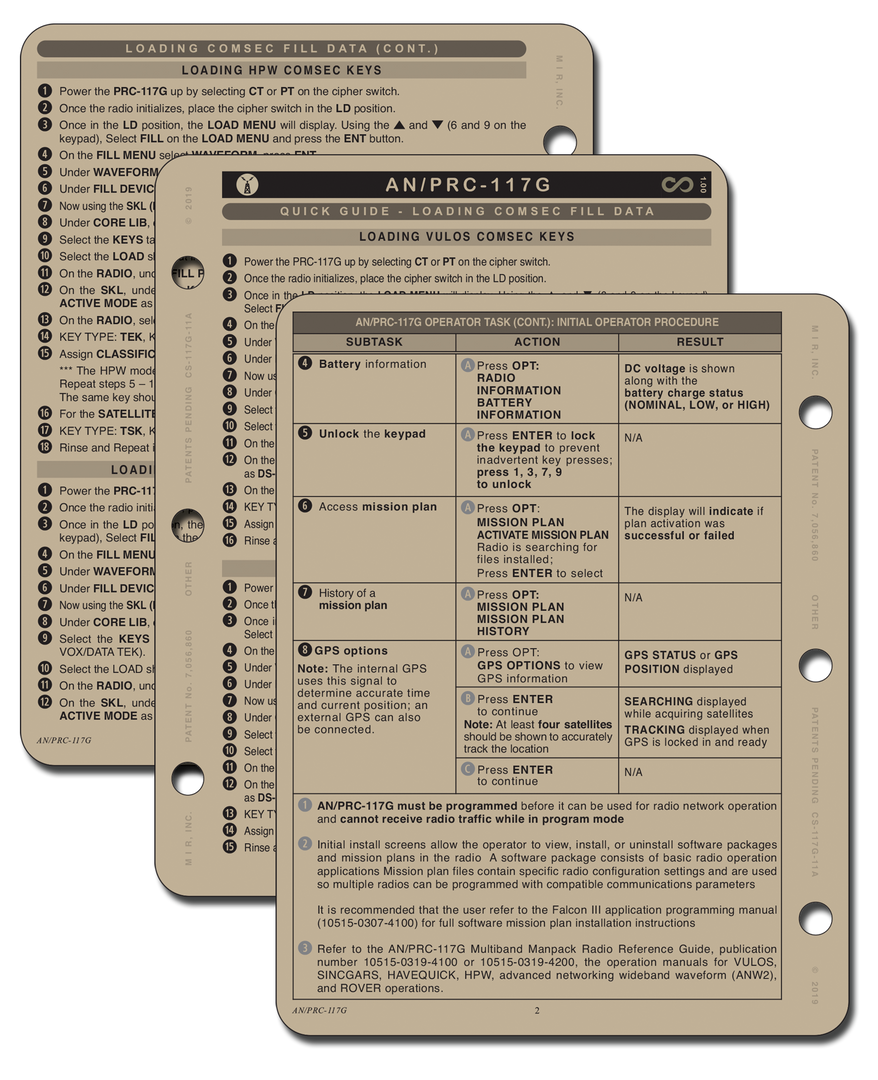 Initial Operator Procedure, Loading Comsec fill data, Vulos comsec keys, Loading SCM comsec keys, loading HPW comsec keys, loading SINCGARS comsec and transec data, Line-of-sight (voice), Satcom (voice), Vulos situational awareness (LOS and SAT), Initial radio setup for HPW operations, Loading radio with comsec key for HPW operation (SKL) (TKL), LOS HPW operations (PPP cable), Programming HPW software for HPW operations, dedicated satcom (HPW) 25k, 5k, SCM config, Program preset SCM, Operate SCM waveform, IW, Loading keymat and transec with PYQ-10/SKL, Sincgars programming, Los situational awareness-trans/receive, CPA mission plan, ANW2.