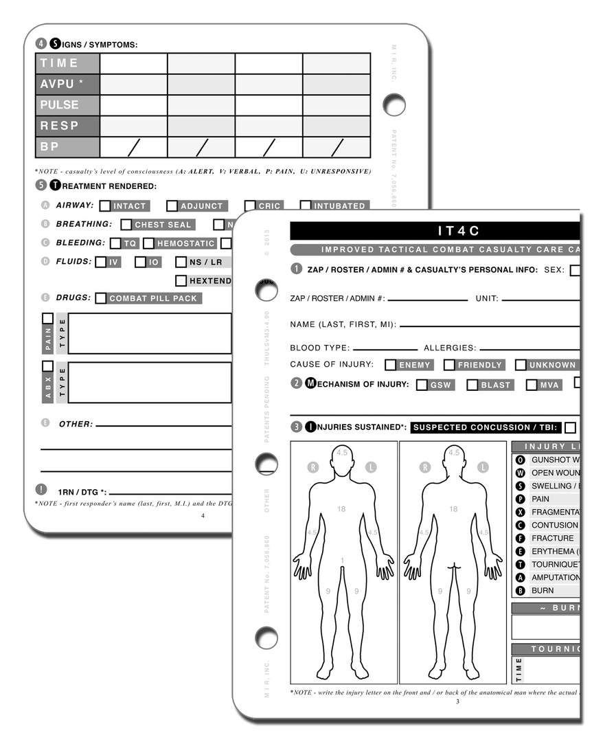 Designed with the non-medic in mind in an intuitive and user-friendly “check the box” format. Can be issued to soldiers as part of their IFAK and carried and used during both training and combat operations, enabling combat lifesavers and medics to train on the same card that they use in combat. A resource that can be used repeatedly in schoolhouses and during unit training as an intuitive, cost-effective item that enhances combat efficiency and builds “muscle memory”. Works seamlessly with the new MIST report required at the end of each 9-Line TACEVAC Request. The entire first-aid / pre-hospital care documentation / TACEVAC request process can be rehearsed over and over using the IT4C and the THULS 9-Line TACEVAC Request with MIST.