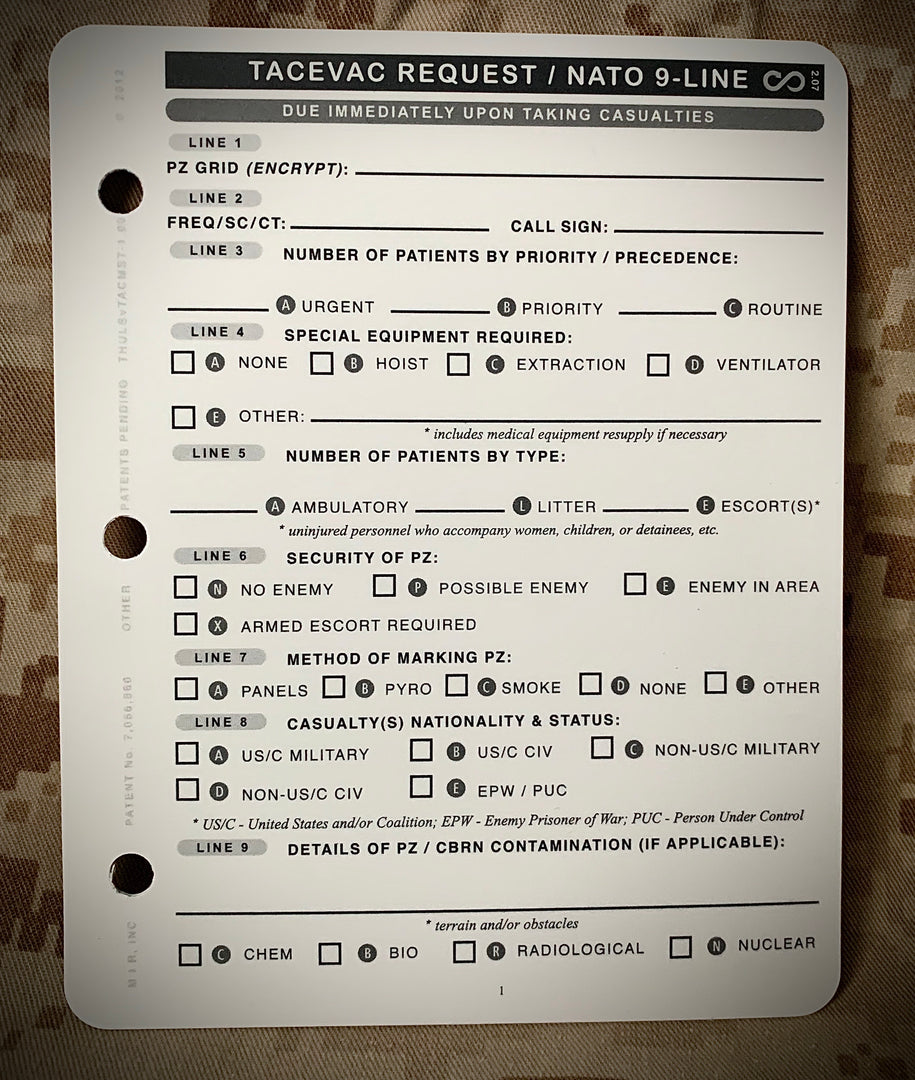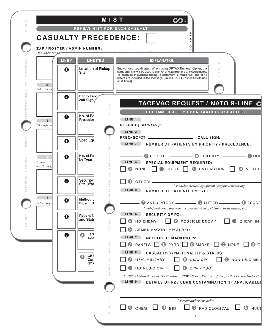 Developed to provide platoon sergeants / commanders and team / squad leaders a professional template combining MEDEVAC / CASEVAC in the NATO 9-line format. Provides neccessary information required to reach the patient’s location, and allows medical personnel to properly triage patient(s). The MIST Report is on the opposite side of the NATO 9-Line CASEVAC. The MIST includes: ZAP / ROSTER / ADMIN NUMBER M – Mechanism of Injury (mine, GSW, RPG, RTA, etc.) I – Injuries Sustained (found and or suspected) S – Signs / Symptoms (pulse rate, blood pressure, respiratory rate) T – Treatment Rendered (morphine, tourniquet, etc.) Should be carried by every member of the team. Fits perfectly in sleeve or breast pocket.