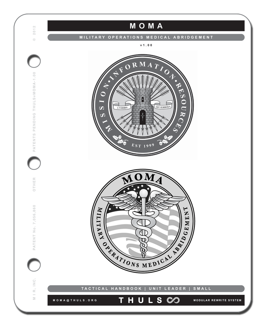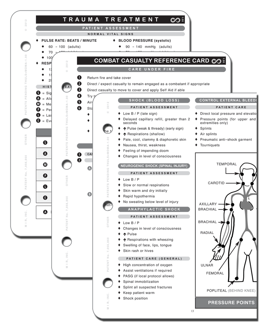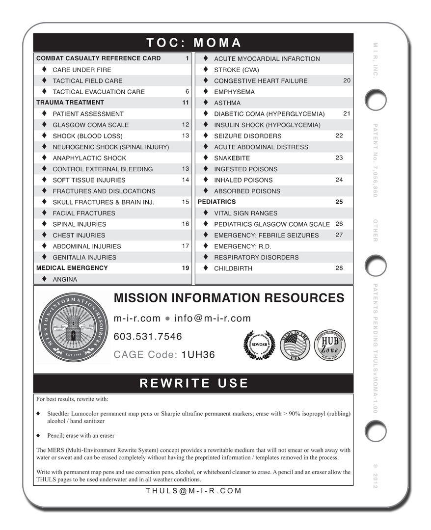This compact manual contains Combat Casualty Reference Card, Trauma treatment information, Medical Emergency information, and Pediatrics.Â